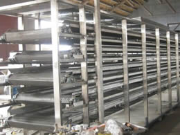 多層網(wǎng)帶式烘干機(jī)、環(huán)保型網(wǎng)帶式烘干機(jī)優(yōu)點(diǎn):潔凈熱空氣、烘干效率高,烘干色澤好等。換熱器放置于網(wǎng)帶上下位置加熱均勻、熱效率高??啥嗯_組合串聯(lián)使用,有效增加干燥面積。