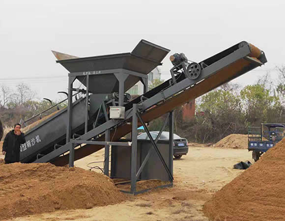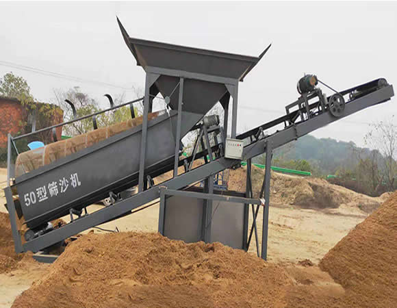 滾筒篩沙機是仿照人工利用斜面篩網篩砂的工作原理,采用平置滾篩筒,并保證料流在篩筒中的多圈內螺旋葉片間可連續(xù)滾篩五圈以上,從而使砂料反復翻滾、滑動而充分離散、分離;滾筒式篩沙機不同于斜置滾篩引起的大小料相互推擠、埋壓,篩分過程匆忙;也不同于斜置滾篩或斜置振動篩所引起的大小料相互沖擠或大料托小料振跳而引起的篩分不干凈、混料現(xiàn)象。滾筒篩內的打砂裝置,可對呈團砂塊打碎、打散。滾篩網面安裝的網面清理裝置可對粘附砂土自行清理以防堵塞網孔。