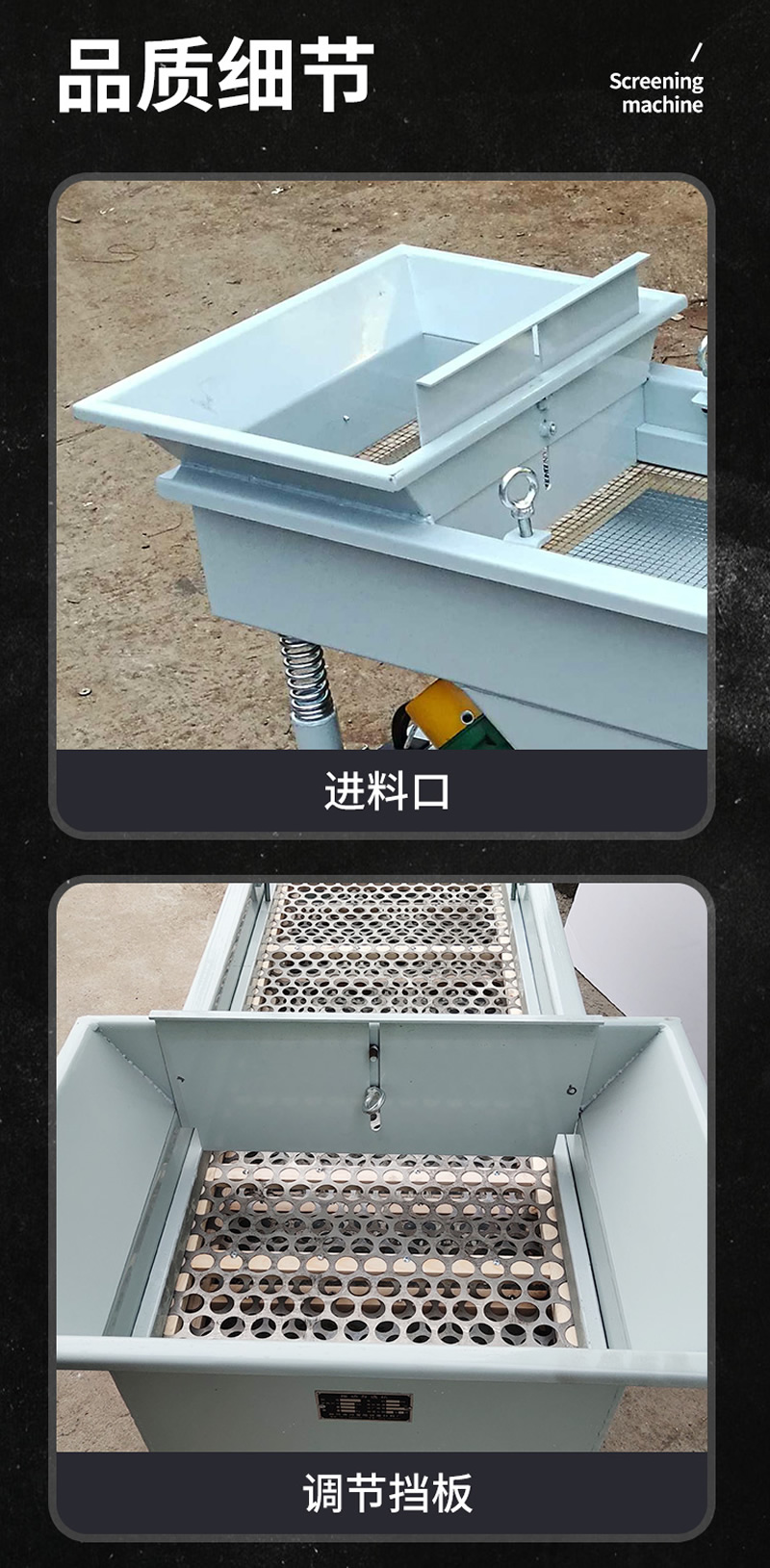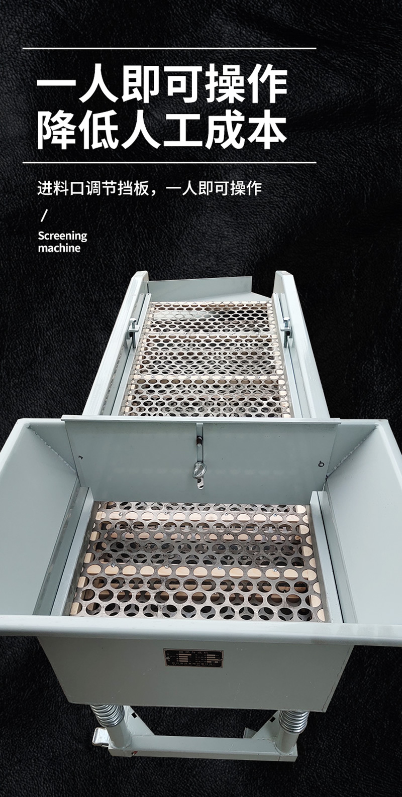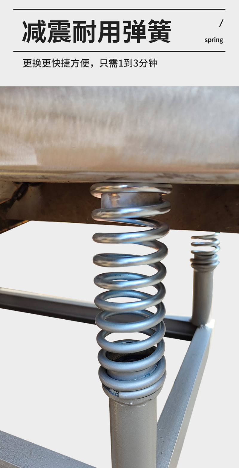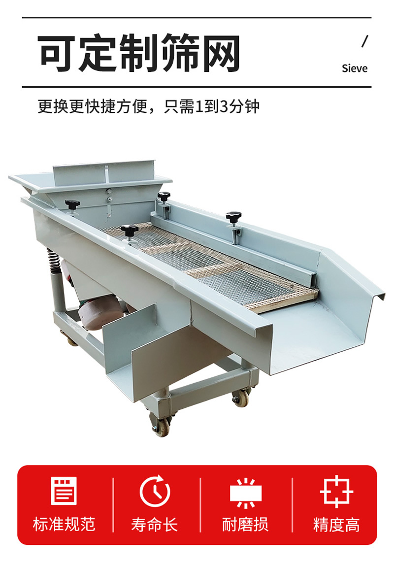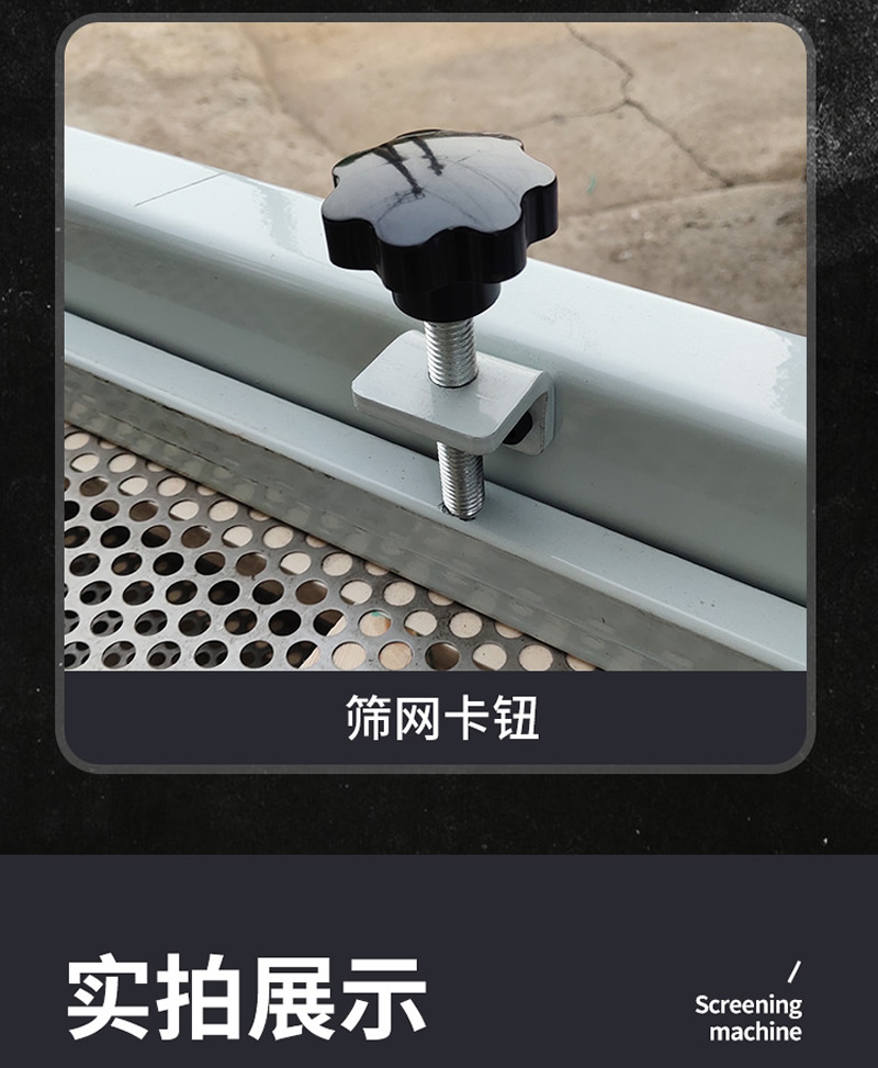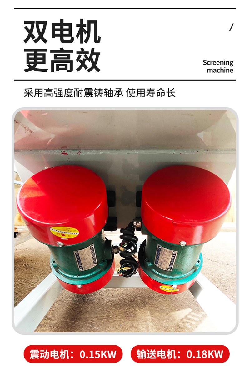 2、振動篩選機可選用220V-2.2kw或380V-1.5kw電機做動力源,集風選和篩分為一體,能干凈徹底地清除糧食或油料種子里面的各種雜質和塵土,振動分選機由料斗、機架、傳動機構、風機、風道等五部分組成,機架地腳裝有四個輪子,方便移動;篩網與機架采用分體式結構,便于更換各種不同目數的網篩。