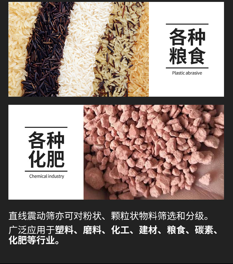 1、【振動篩分機:】常用于小麥、水稻、玉米、大豆、棉種及各種油料種子的精選、分級和除雜。適合廣大種糧收糧大戶和飼料加工廠使用。,振動篩選機篩選大豆和玉米每小時3噸,篩選小麥和水稻每小時2噸,篩選棉種和油料種子每小時500-1000公斤。對糧食和油料里面的灰塵、碎屑、壞糧及小石子等雜質,篩分率達到95%以上!。